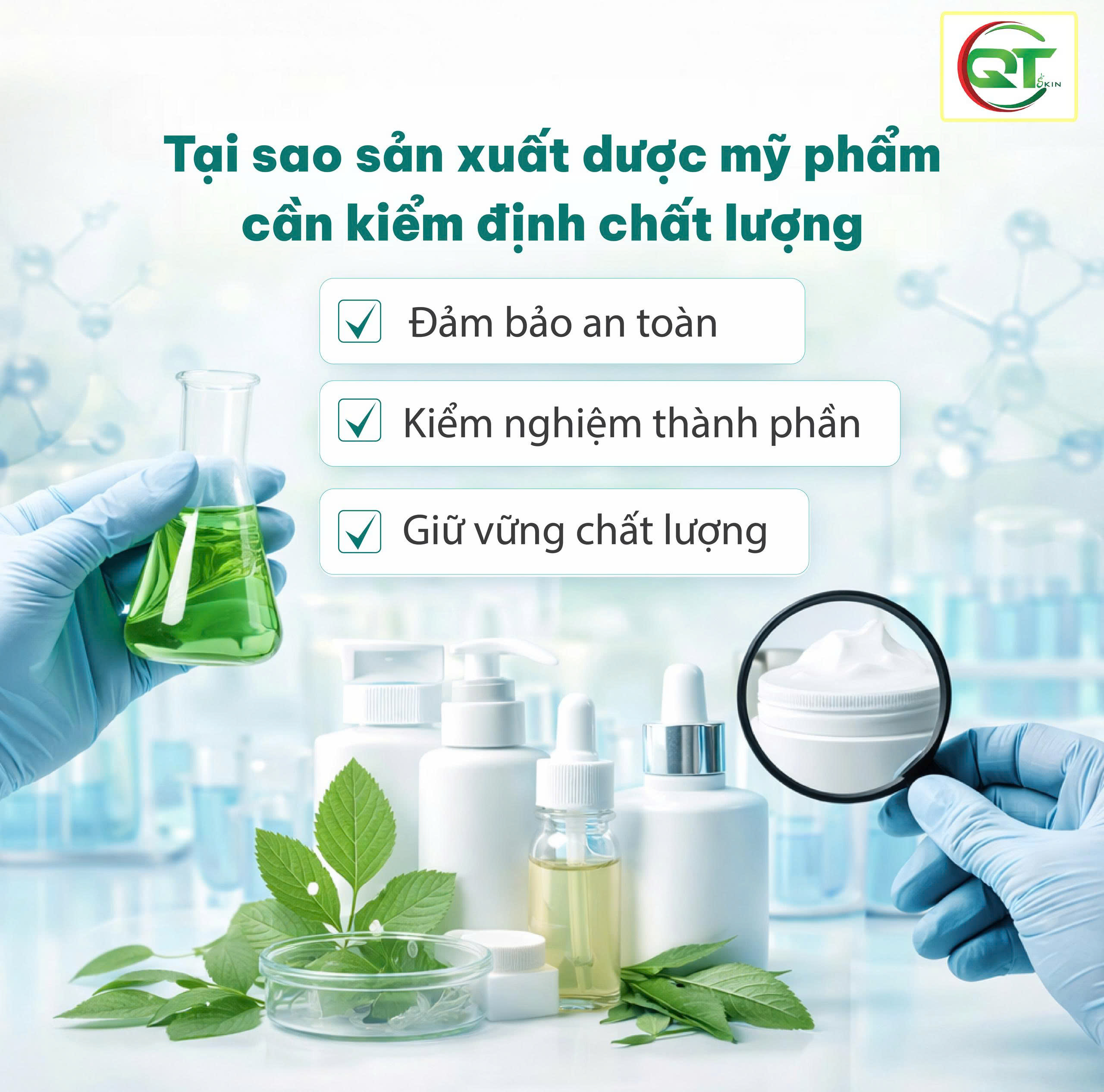 Tại Nhà máy QT Skin, chúng tôi đầu tư hệ thống phòng thí nghiệm hiện đại, đội ngũ kỹ thuật chuyên môn cao và quy trình kiểm soát chất lượng nhiều tầng nhằm đảm bảo mỗi sản phẩm xuất xưởng đều đạt tiêu chuẩn cao nhất.